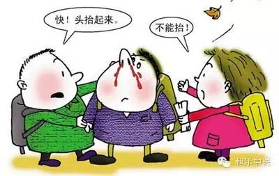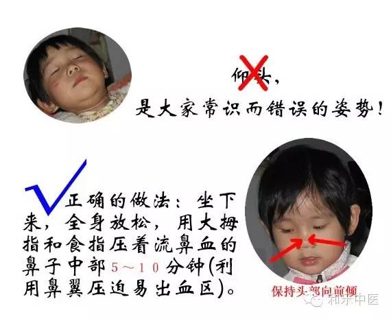出現流鼻血時,家長常習慣讓孩子將頭向後仰,鼻孔朝上,認為這樣做可以有效止血,其實是錯誤的。流鼻血時後仰的姿勢會造成鼻腔內已經流出的血液因姿勢及重力的關係,向後流到咽喉部,並無真正止血效果;流入胃腸道的血液,刺激胃腸黏膜產生不適感或嘔吐;出血量大時,還容易吸嗆入氣管及肺內造成危險。
