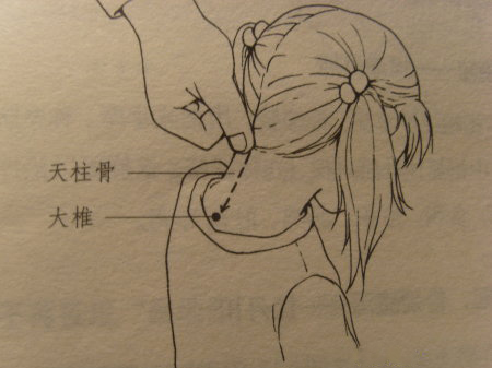 推下天柱骨:天柱骨在頸後髮際正中至大椎成一直線,位於各頸椎棘突連線上。具體做法:用拇指或食中二指自後髮際正中自上往下推100下。