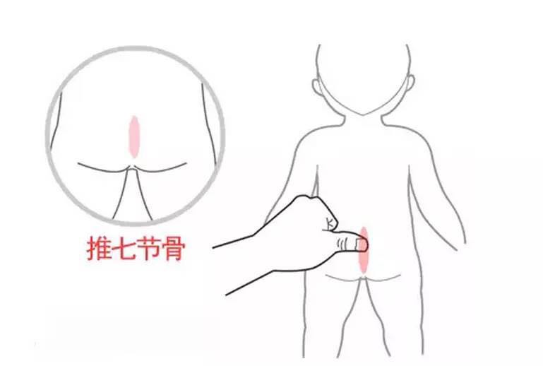 推下七節骨:七節骨在在第四腰椎(督脈腰陽關穴)至尾椎骨端(督脈長強穴)成一直線,推下七節骨多用於治療腸熱便秘或痢疾等病症,切記方向不可弄錯,由腰至尾骨方向為清熱通便,由尾骨至腰方向為推上七節骨,有澀腸止瀉的作用。