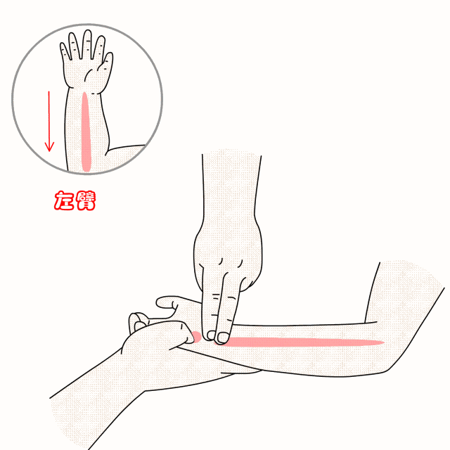 手法:用一只手握住孩子的手腕,使其掌心向上,然后用中指、食指指腹自孩子腕横纹推向肘横纹直推,推的方向一定是从腕到肘,不可反向操作!