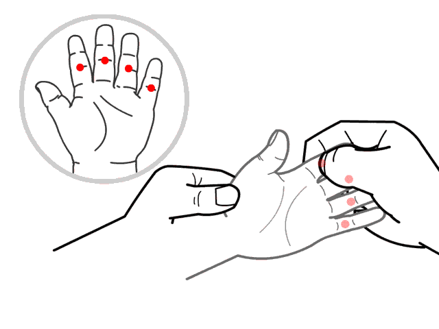 位置:四横纹在手掌面,食指、中指、无名指和小指第一指间关节横纹处(注:“指间关节”即指骨与指骨之间形成的关节)。